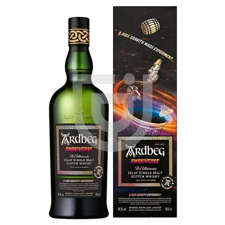 Az Ardbeg Smokiverse Whisky az Ardbeg Day 2025-ös különleges, limitált kiadású Islay single maltja, amellyel a lepárló a Committee 25. évfordulóját ünnepli, és egyben új íz-univerzumba lép: ez az első Ardbeg, amelyet úgynevezett high-gravity cefrézéssel készítettek, vagyis kevesebb vízzel és jóval több malátával, hogy még sűrűbb, koncentráltabb aromavilág szülessen. A főként ex-bourbon hordókban érlelt, nem hűtve szűrt, 48,3%-os erősségű whisky fényes arany színben mutatkozik meg, és már az első korty előtt érződik rajta, hogy ez az Ardbeg a kísérletező, játékos oldalát hozza: a tőzegfüst nem nyers és szögletes, hanem rétegzett, édeskés és ásványos, mintha egy füstbe burkolt gyümölcsös desszert és egy izzó faszénparázs találkozna egyetlen pohárban.