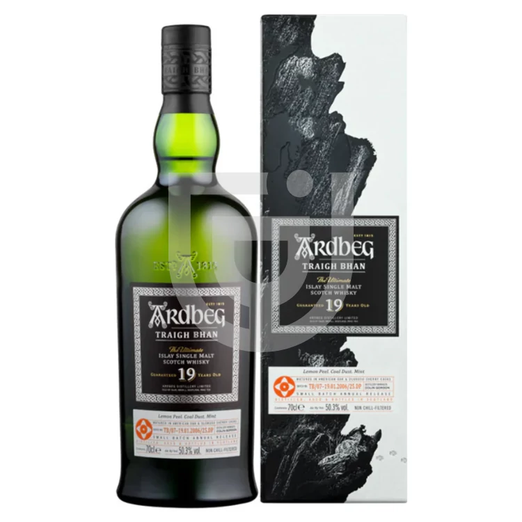 Az Ardbeg Traigh Bhan 19 Years Batch 7 egy limitált, 19 éves Islay single malt whisky, amely a Traigh Bhan sorozat méltó lezárása: az ikonikus „éneklő homokos” partszakasz sós, szeles világát és az Ardbeg telt, tőzeges karakterét egy palackba sűríti. A 2006-ban lepárolt, majd 2025-ben palackozott whisky amerikai tölgy ex-bourbon és kiemelten nagy arányban első töltésű Oloroso sherryhordók házasításából született, így a klasszikus Ardbeg füst mellé sötétebb, mélyebb tónusok – sós karamell, eszpresszó, száraz kakaó és fűszeres melegség – társulnak. A 50,3%-os, nem hűtve szűrt palackozás még intenzívebben mutatja meg az Islay-part ásványos, jódos karakterét, miközben a citrusos frissesség (citromhéj, bergamott), a mentás–eukaliptuszos hűvösség és a szárított fűszerek rétegesen épülnek egymásra. A Traigh Bhan Batch 7 egyszerre gyűjtői darab és komoly kóstolnivaló: mély, olajos textúrájú, sötét arany színű füstös skót whisky, amelyben a sherryhordók gazdagsága és az Ardbeg jellegzetes, orvosos tőzegfüstje harmonikus, mégis erőteljes egyensúlyba kerül.