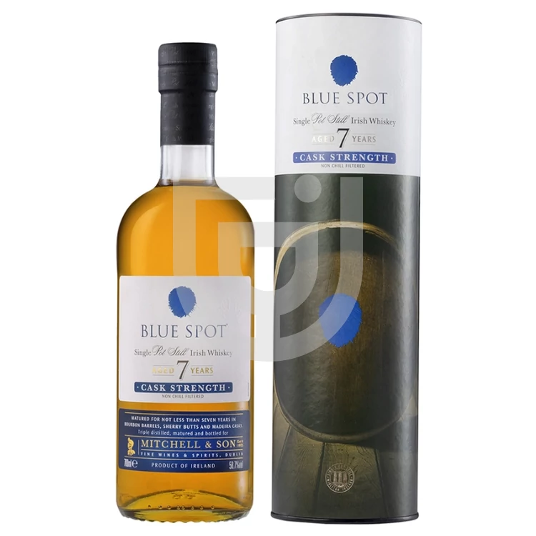 A Spot Whiskey kollekció neve a Mitchell család hagyományához vezethető vissza, akik az érlelő hordókat színes festékfoltokkal (spotokkal) jelölték, hogy megkülönböztessék a párlatok korát. A Blue Spot, vagyis a kék folt a 7 éves whiskeyt, a Green Spot, azaz a zöld folt a 10 éves whiskeyt, a Yellow Spot, azaz a sárga folt a 12 éves whiskeyt, míg a Red Spot, vagyis a piros folt a 15 éves whiskeyt jelölte. A Blue Spot Single Pot Still Irish Whiskey 1960-ban eltűnt a boltok polcairól, azonban 2016-ban újra piacra dobták! A három hordós érlelés mintapéldáját tapasztalhatjuk meg ebben a tételben; az ex-Bourbon, a spanyol sherry és a portugál Madeira hordó szentháromsága találkozik a palackban. A 7 évig tartó érlelés kihozza az ízekből a maximumot, így egy ízgazdag és végtelen komplex ír whiskey kerül a kék foltos palackba. A Madeira és a sherry hordó fantasztikus gyümölcsökkel és fűszerekkel ajándékozta meg a párlatot, az ex-Bourbon hordó pedig a pikáns, vaníliás vonalvezetésével lekerekíti a párlatot és egyensúlyba hozza az ízeket. A Blue Spot Single Pot Still Irish Whiskey az ír whiskey rajongók minden igényét kielégíti, ugyanakkor az erősebb ízek kedvelőinek is kedvez a hordó erős palackozással!