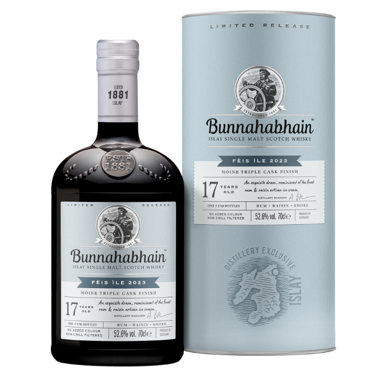 A Feis Ile eseménye minden évben megrendezésre kerül Islay szigetén és híres az ott bemutatott különleges, füstös whiskyjeiről, kóstolóiról, programjairól, amelyet a sziget lepárlói szerveznek. A Bunnahabhain 17 Years Mòine Triple Cask Whisky-t a Feis Ile 2023-on mutatták be és nekünk is volt szerencsénk beszerezni ebből a limitált ritkaságból néhány palackot! Ha bár a Bunnahabhain alap szortimentje híres a tőzeg mentes tételekről, Feis Ile idején azért megmutatják, hogy tudnak ők ilyet is csinálni, nem is akárhogy! Ez a tétel 3 erősen tőzegelt skót single malt whisky házassága, amely három különböző hordóban öltötte magára gazdag ízvilágát: ex-Bourbon, ex-Oloros sherry és ex-Rumos hordók adják az ital gerincét. Ennek a szentháromságnak köszönhetően Islay füstjéből édes, trópusi gyümölcsös, mazsolás jegyek bújnak elő és együttes harmóniában alkotnak meg egy csúcsprémium párlatot, amely a skót whisky rajongóinak ízlésére lett csiszolva, hordó erősen palackozva. A Bunnahabhain 17 Years Mòine Triple Cask Whisky minden kortya egy csodás utazás Islay szigetére, mindenképp érdemes lecsapni rá, hiszen limitált darabszámban került csak piacra!