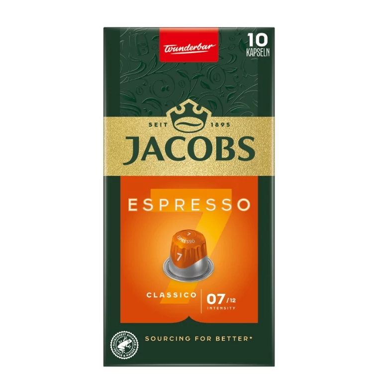 Jacobs Espresso 7 Classico - kiegyensúlyozott, elegáns íz, gyümölcsös jegyekkel! A kellemes Jacobs Espresso 7 Classico kávékapszulák tökéletesen ötvözik a kiváló minőségű Arabica kávék lágyabb karakterét a Robusta fajtára jellemző intenzív aromákkal. Ideális választás azoknak, akik egy kifinomult aromájú és kellemes, gyümölcsös ízjegyeket hordozó, kiegyensúlyozott eszpresszóra vágynak.