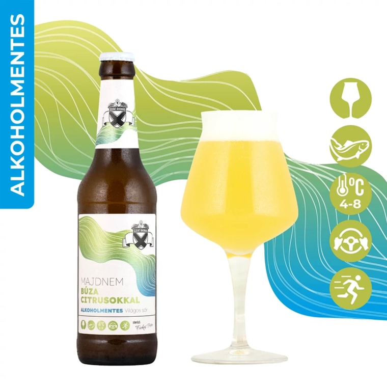 Mivel a Szent András Sörfőzdében mindenkinek van egy sörünk, így nem feledkeztünk meg azokról sem, akik sportolnak, vezetnek, vagy csak odafigyelnek az energiabevitelükre, ezért gondoltunk egy nagyot és arra jutottunk, egy kis módosítással működne ez alkoholmentes verzióban is. Négy különböző „mentes” sörrel a hátunk mögött már könnyebb volt a feladat, de a végeredmény tényleg magáért beszél. Nagy büszkeséggel mutatjuk be az alkoholmentes sörcsaládunk következő állandó darabját, a MAJDNEM BÚZÁT CITRUSOKKAL, ami garantáltan lecseréli a limonádét minden sörkedvelő kezében. Sörünk egy berliner weisse alapra helyezett citrusos frissítő, amit citrommal, lime-mal és bergamott naranccsal turbóztunk fel megalkotva ezzel az alkoholmentes sörök, a magas minőségű gyümölcslevek és a nagy gonddal készített házi limonádék legnagyobb versenytársát. A MAJDNEM BÚZA CITRUSOKKAL ugyanis nem különösebben édes, de nem is kifejezetten savanyú, Inkább ezek jól eltalált összjátéka, ami egyszerre oltja a szomjat és ajándékoz meg minket gyümölcsös sörélménnyel. Mint a MAJDNEM sörcsalád korábbi alkoholmentes tagjainál itt is három célt tűztünk ki sörünk megalkotása előtt: mi magunk szeretnénk legyártani és ellenőrizni ezt a darabot is, az így létrejött sör ízvilága megtévesztően hasonlítson az alkoholos német típusú búzasör, azaz berliner weisse testvéréhez és végül, de nem utolsósorban valóban alkoholmentes (<0,5%) legyen, mert ez nem játék, ahogyan a sör számunkra sosem az. Tiszta lelkiismerettel kijelenthetjük – ahogyan korábban is - mindhárom feltétel teljesült. A MAJDNEM család sörei nem csak alkoholmentesek, de az alkoholos változatokhoz képest minimális kalóriát tartalmaznak (itt 80 kcal/üveg), így ez a sör is jó alternatíva lehet azoknak, akik odafigyelnek az alakjukra, a tudatos táplálkozásra, de nem akarnak lemondani a sörözés élményéről sem.